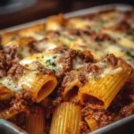 A comforting and hearty dish of rigatoni filled with rich beef ragu and melted cheese, perfect for family dinners or gatherings.