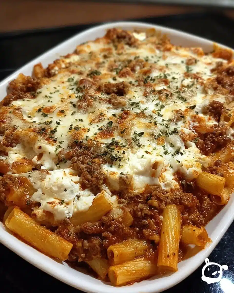A hearty and comforting Baked Ziti with Ground Beef and Ricotta, perfect for family dinners or gatherings.