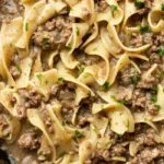 A comforting one-pot meal that combines ground beef, egg noodles, and savory broth, perfect for busy weeknights.