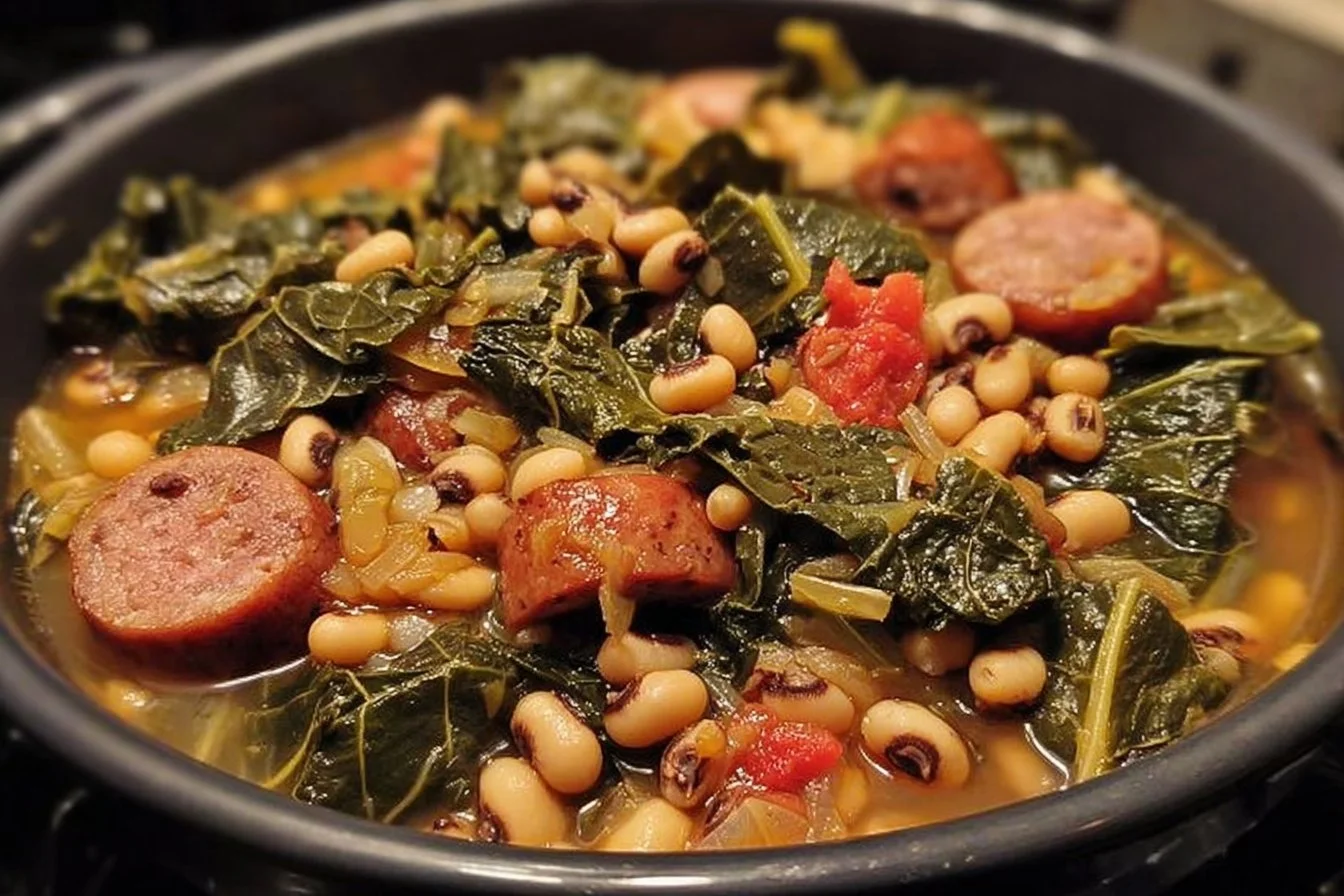 A comforting Southern dish filled with black-eyed peas, smoked sausage, and collard greens, perfect for any season.