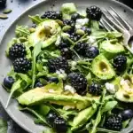 A vibrant salad combining blackberries, avocados, and arugula, topped with a zesty vinaigrette for a refreshing meal.