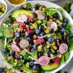 A refreshing and vibrant salad packed with sweet blueberries, crunchy pistachios, and creamy avocado, perfect for spring gatherings.
