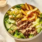 Serve your burger bowls with sides that complement their flavor profile. A light, refreshing coleslaw or even air-fried veggie fries can elevate the meal further. For a cozy night in, pair your bowl with a chilled drink like iced tea or sparkling water with a slice of lemon for a refreshing touch.
