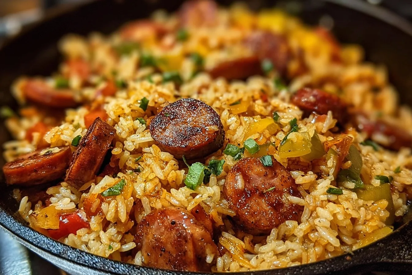 A vibrant and flavorful one-pan meal featuring smoked sausage, rice, and colorful bell peppers, perfect for busy weeknights or family gatherings.