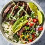 - Assemble the bowls by creating a base layer of cilantro lime rice. Add the sliced steak on top, along with black beans, corn, and diced avocado for a colorful presentation.