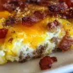 A delicious breakfast casserole combining eggs, crispy bacon, cheese, and hash browns, perfect for brunch or a family breakfast.