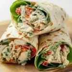 • Place lettuce leaves on each tortilla if using, spoon the chicken salad mixture down the center, then fold the sides and roll tightly so the filling stays contained.