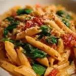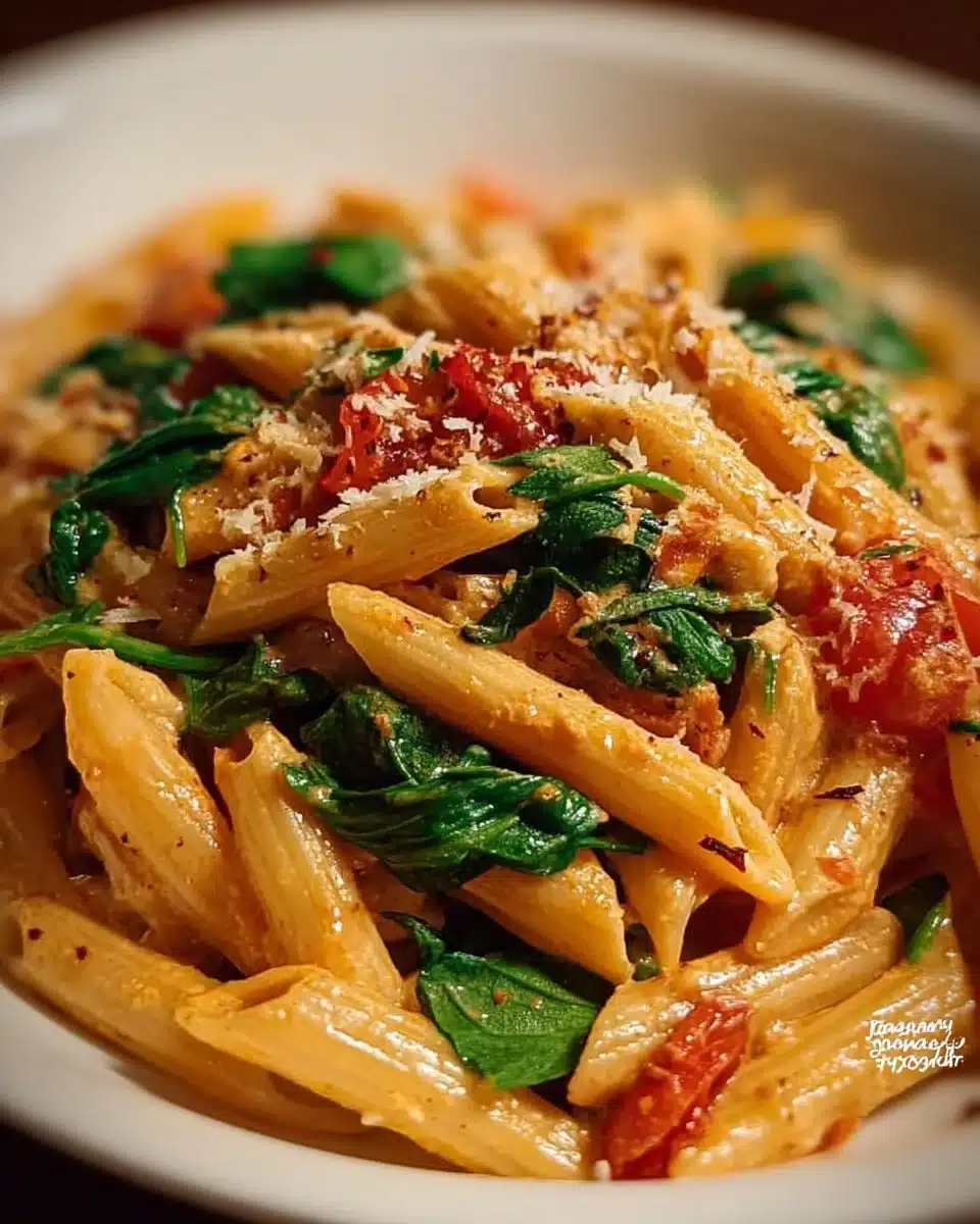 A simple yet delicious one-pot meal featuring creamy penne pasta, fresh spinach, and tomatoes – perfect for weeknight dinners.