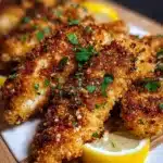 Delightful, golden, and crispy chicken tenders bursting with the zesty flavor of lemon and savory goodness of Parmesan cheese, perfect for a quick weeknight dinner!