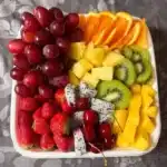 While the recipe suggests red grapes, strawberries, pineapple, orange, kiwi, mango, and dragon fruit, you can use any fruits you prefer. Seasonal fruits often taste best, so consider adding peaches, watermelon, or raspberries to make your platter unique.