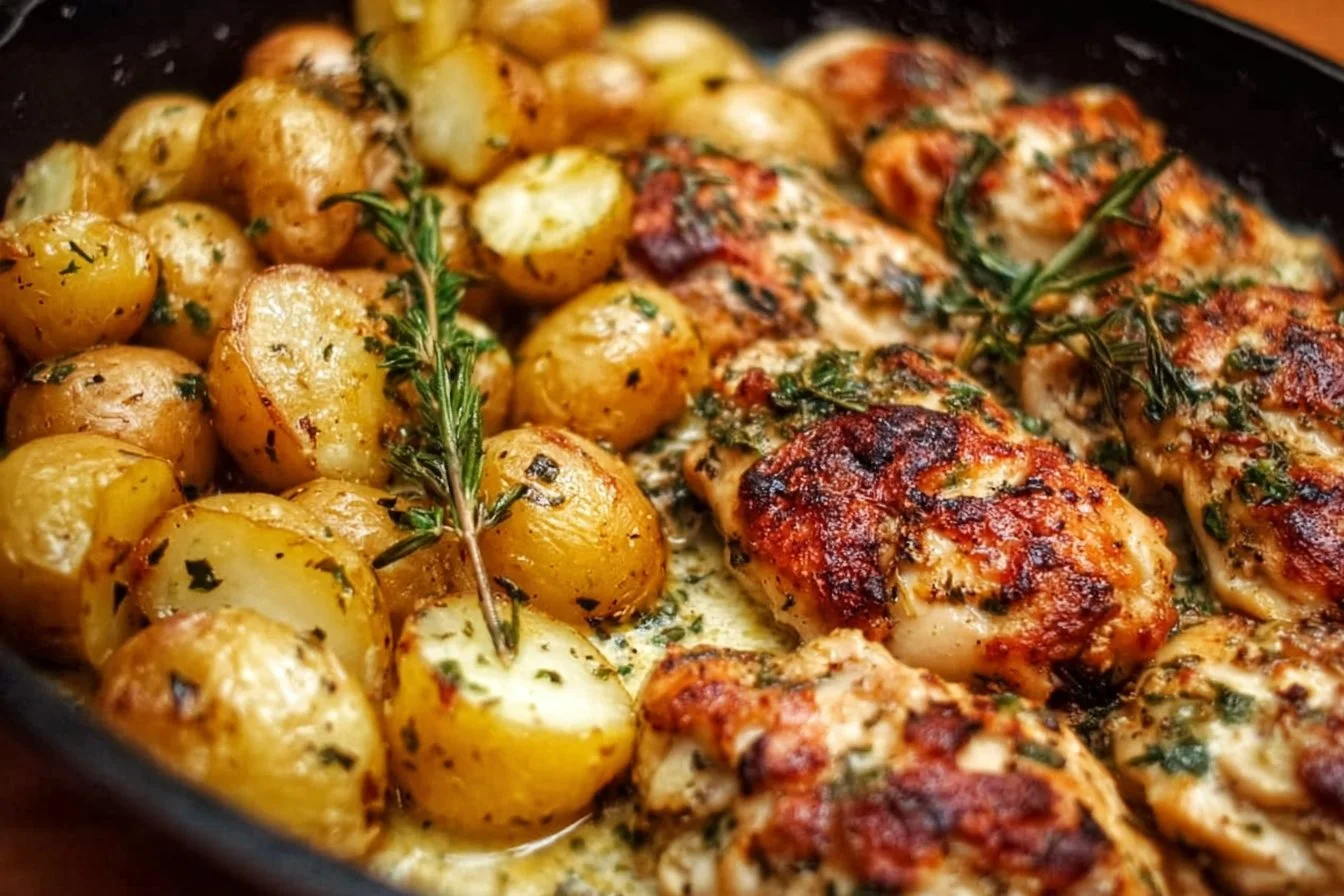 A delightful dish combining tender chicken and flavorful potatoes bathed in a rich garlic and Parmesan sauce, perfect for any occasion.
