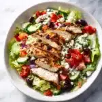 This Greek Chicken Salad is simple to assemble and relies on good ingredients and a straightforward vinaigrette. The method below follows a quick build: greens first, then chicken and vegetable toppings, finished with a shaken vinaigrette. If you’re using store-bought Greek-marinated chicken, warm or serve cold — both work beautifully.