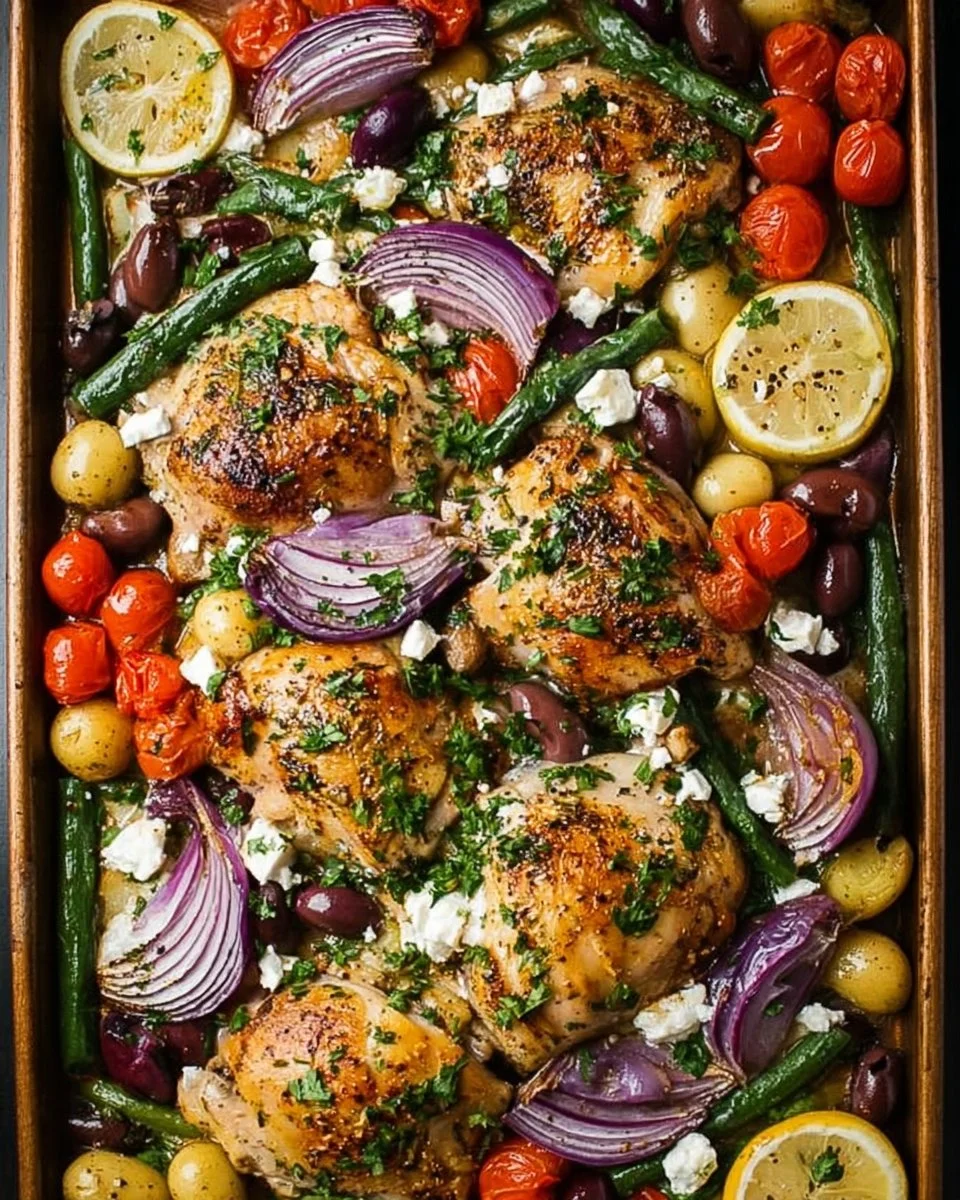 A delicious and wholesome Greek Sheet Pan Chicken that’s easy to prepare and packed with Mediterranean flavors.