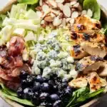 You can prep most components ahead: grill the chicken and store it in the refrigerator for up to 3–4 days, and make the dressing up to 5 days in advance. Keep crunchy toppings (almonds, bacon) and fruit (blueberries, cranberries) separate from the greens; assemble the bowls shortly before serving to keep everything crisp. If you’re making it for meal prep, store portions into containers with dressing on the side to add just before eating.