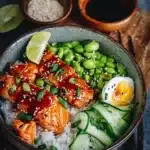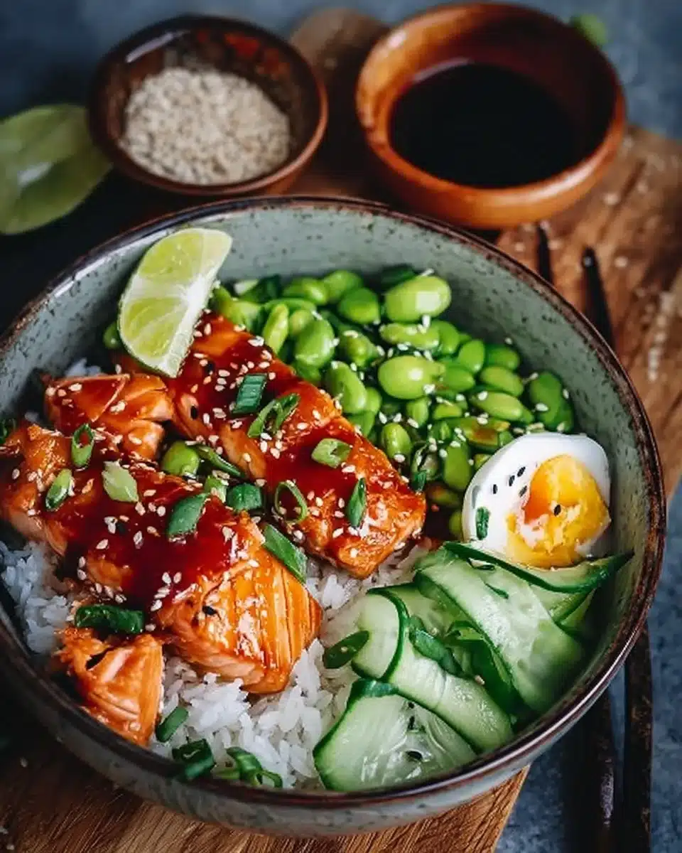 - Assemble bowls with cooked rice, honey sriracha salmon, avocado, cucumber, and edamame.