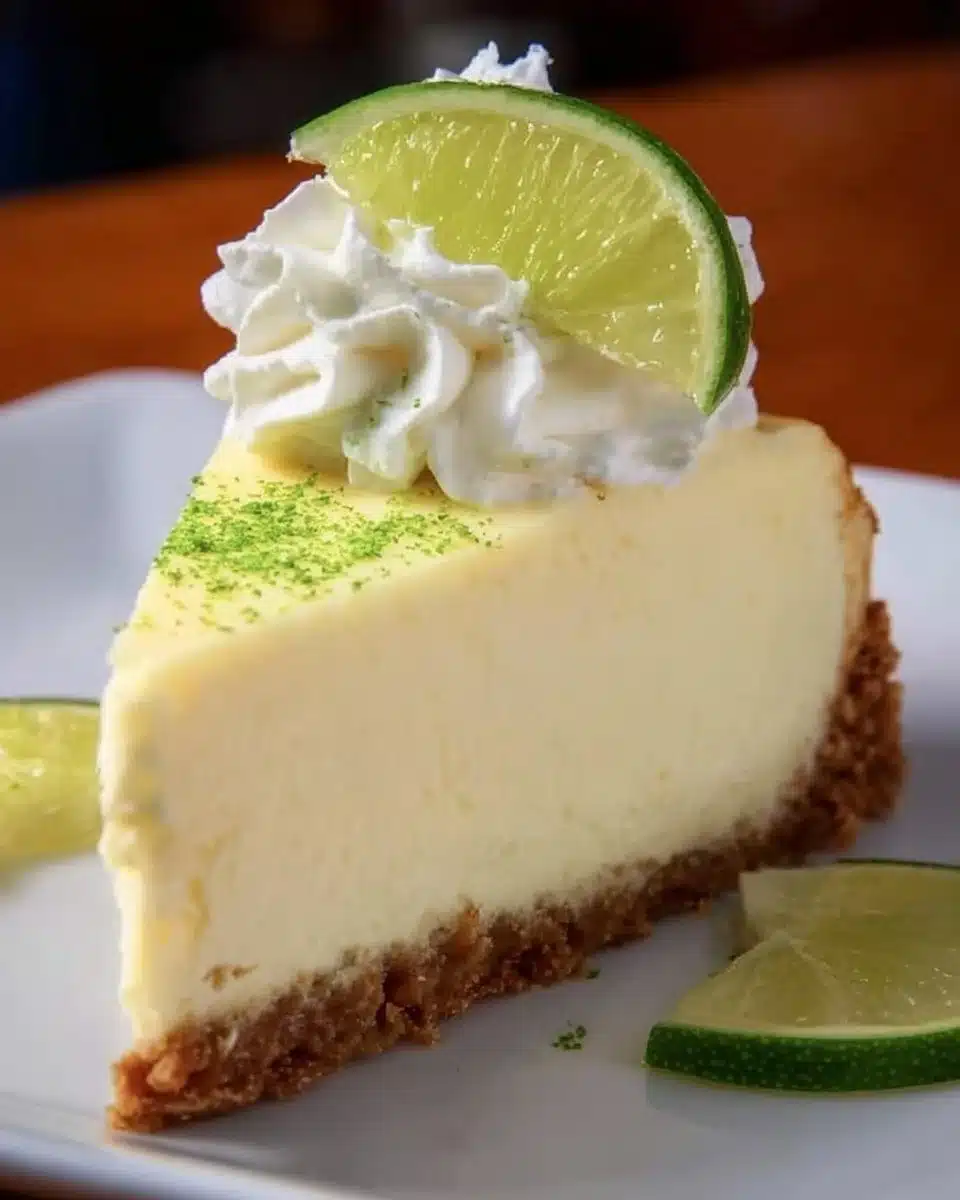 13. Top the cheesecake with whipped cream and garnish with lime zest or slices.