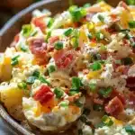 A delightful twist on the classic potato salad, combining baked potato flavors with creamy dressing, savory bacon, and melty cheese.