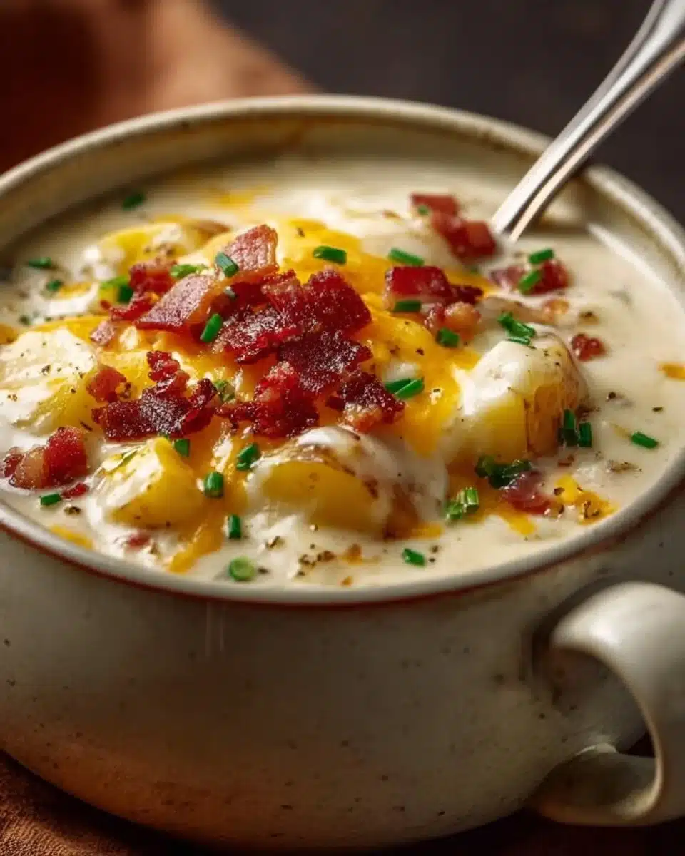 A comforting and creamy soup that combines the heartiness of baked potatoes with rich flavors, perfect for chilly days.