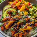 Grilled Maple Sriracha Chicken Bites with Coconut Rice & Mango Avocado Salsa Bowl with Chili Mayo is more than a meal—it’s an experience filled with vibrant flavors that come together beautifully. The sweet-and-spicy marinated chicken pairs wonderfully with the creamy coconut rice and the fresh, zesty salsa. It’s perfect for impressing guests, hosting a casual get-together, or simply treating yourself to a delicious dinner. Embrace the flavors, get creative, and most importantly, enjoy every bite!