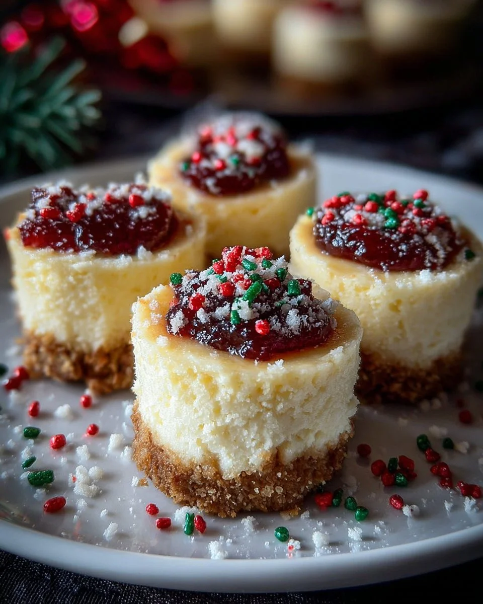 Festive individual cheesecakes perfect for holiday gatherings, easy to make and deliciously decorated.