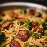 A quick and easy one-pan dish featuring creamy orzo pasta, savory chicken sausage, and fresh broccoli, perfect for busy weeknights.