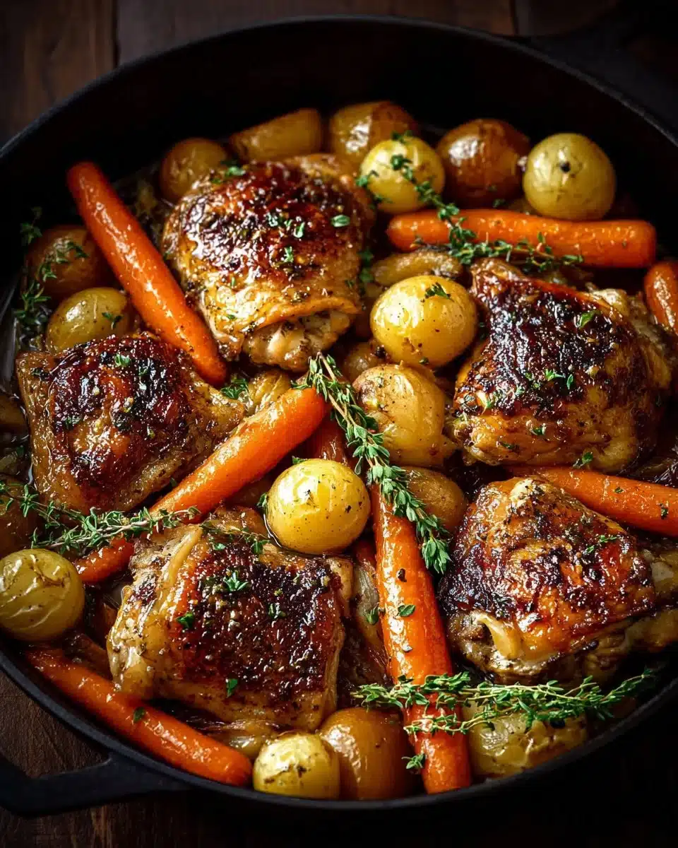 A simple, wholesome one-pan meal featuring succulent chicken thighs roasted with carrots and Yukon Gold potatoes.