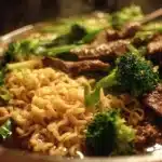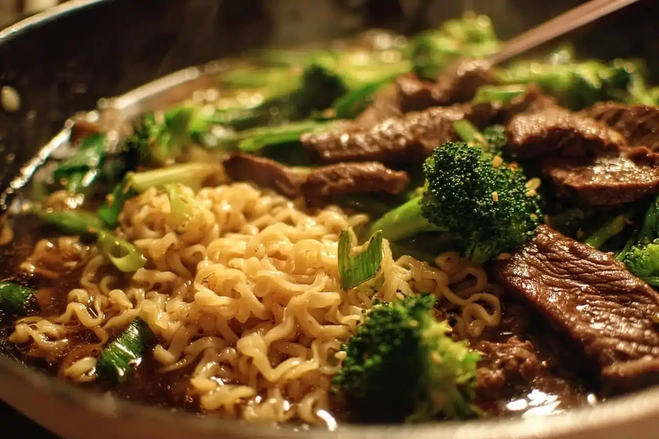 A deliciously simple dish that combines tender beef, crisp broccoli, and soft ramen noodles for a comforting and easy meal.