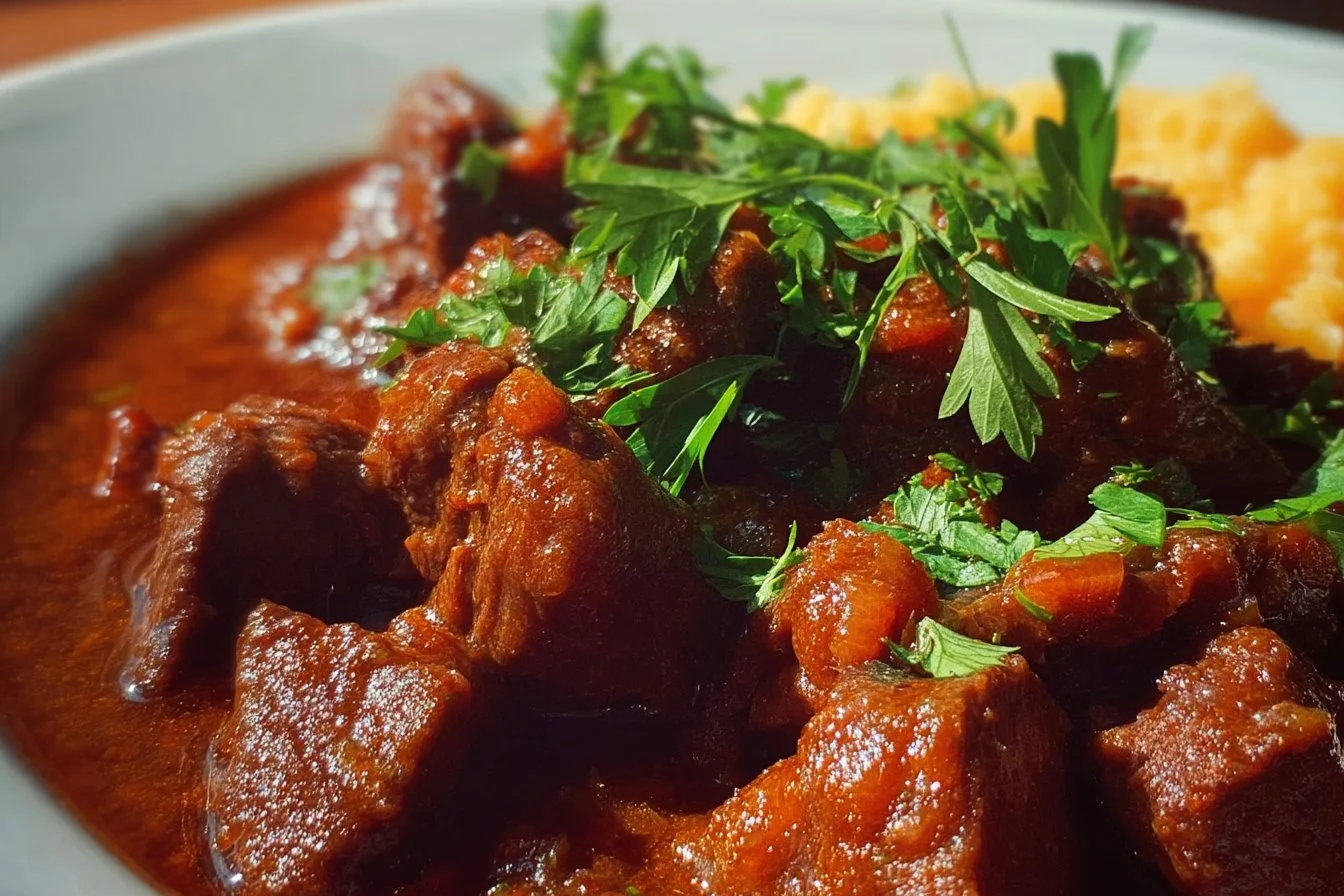 A hearty slow-cooked beef goulash that embodies comfort and warmth, perfect for family gatherings or chilly evenings.