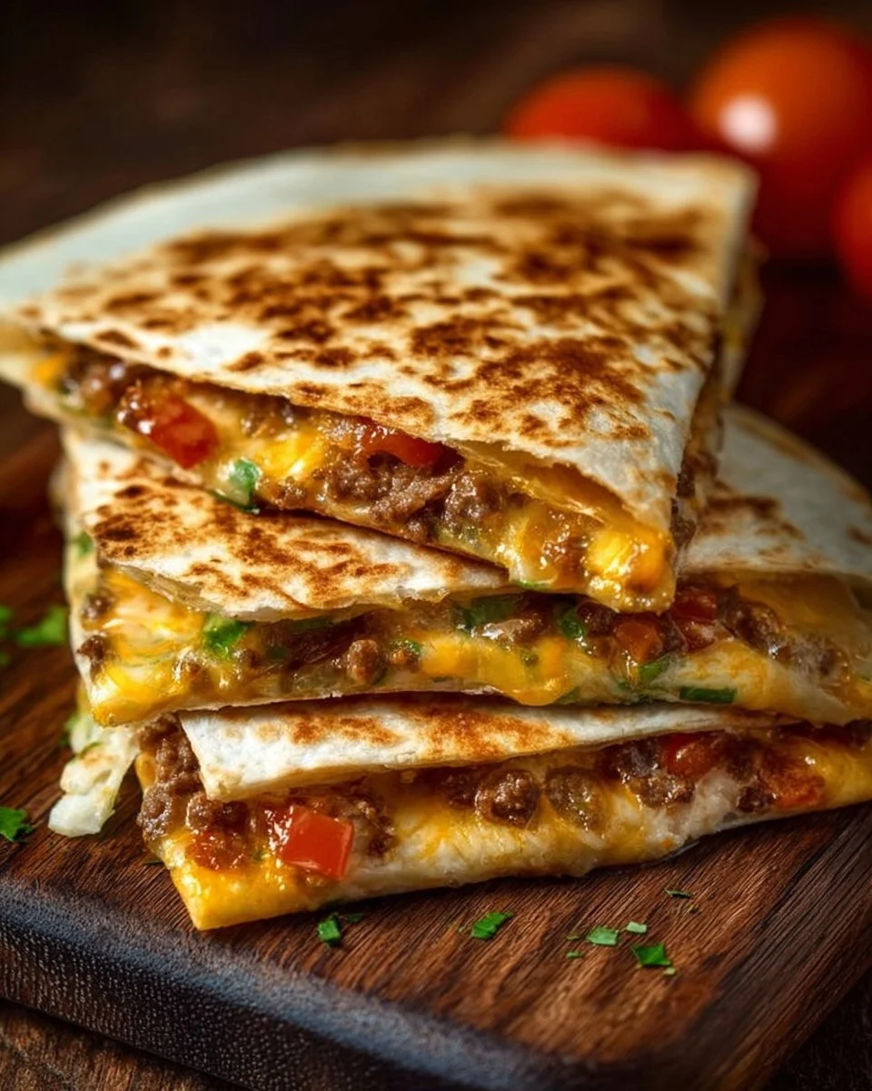 A fun twist on traditional quesadillas, combining juicy burger flavors with the convenience of a quesadilla, perfect for busy weeknights.