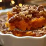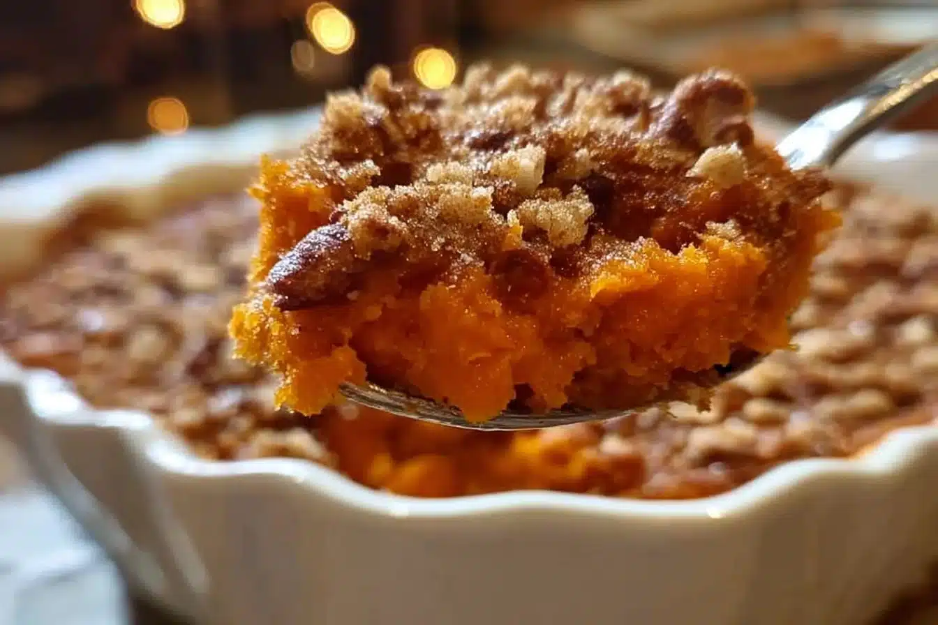A cozy dish featuring creamy sweet potatoes topped with crunchy pecans, perfect for holidays and family gatherings.