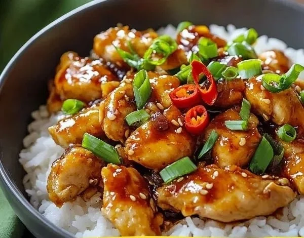 Serve this delicious chicken dish hot, paired with white or brown rice, or a fresh salad. The sweet and spicy sauce complements the rice perfectly, making a wonderful meal. You can also serve it with steamed veggies for a complete and healthy dinner option.