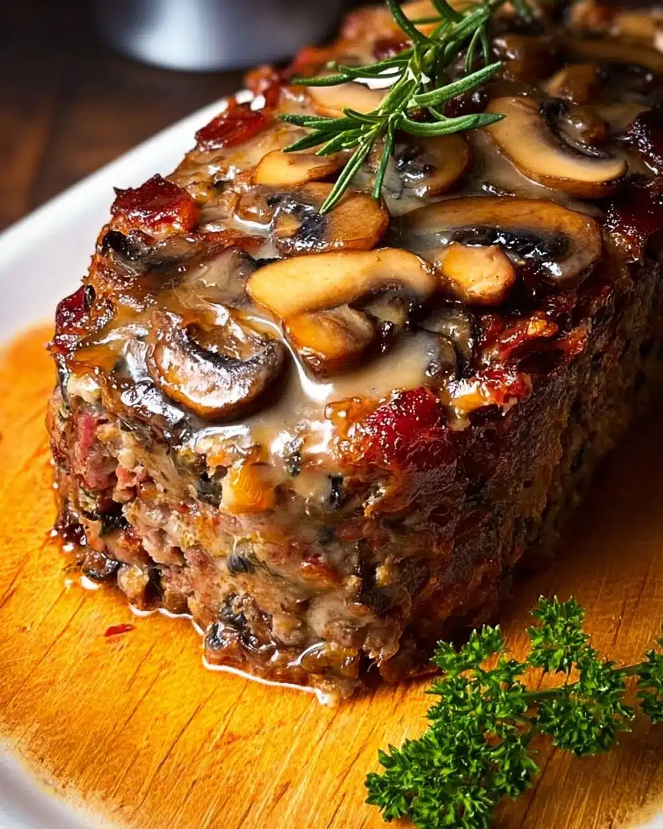 A delicious twist on classic meatloaf with ground beef, Swiss cheese, crispy bacon, and sautéed mushrooms.