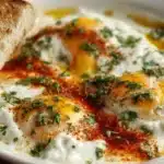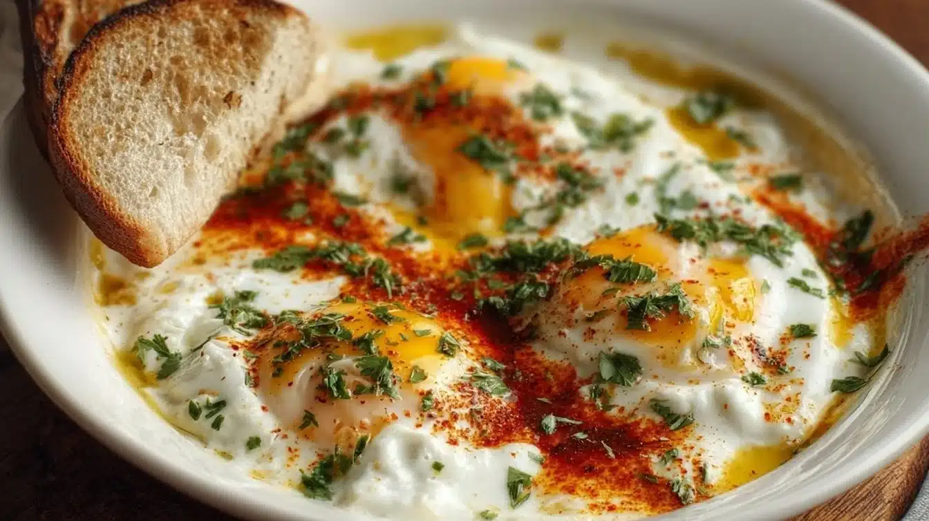 Çılbır is a delightful Turkish dish featuring poached eggs served with creamy yogurt and a rich butter sauce, perfect for breakfast or brunch.