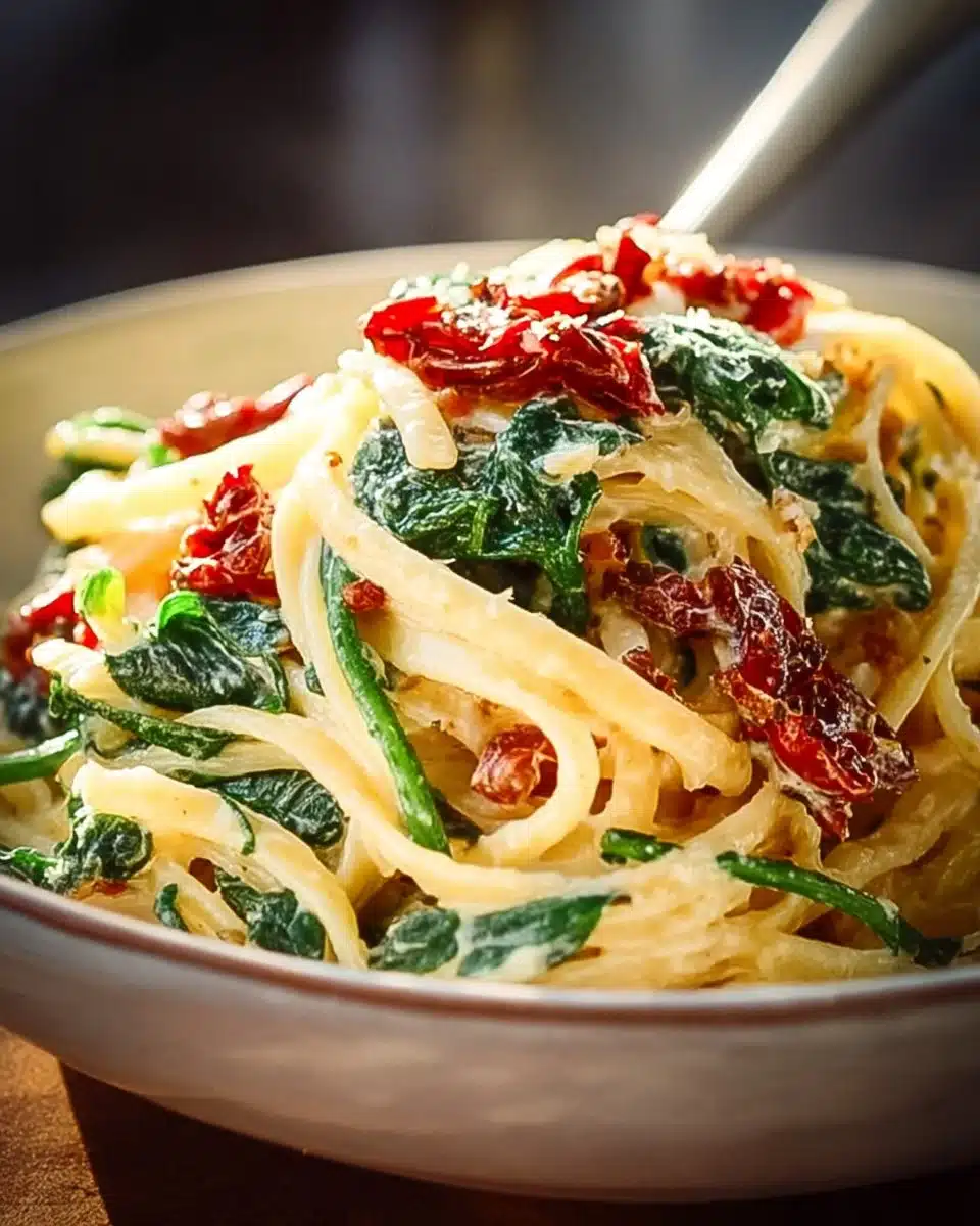 A delightful pasta dish combining fresh spinach and sun-dried tomatoes for a quick and healthy meal.