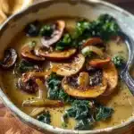 A comforting soup featuring wild mushrooms, caramelized onions, and kale that is perfect for chilly evenings.